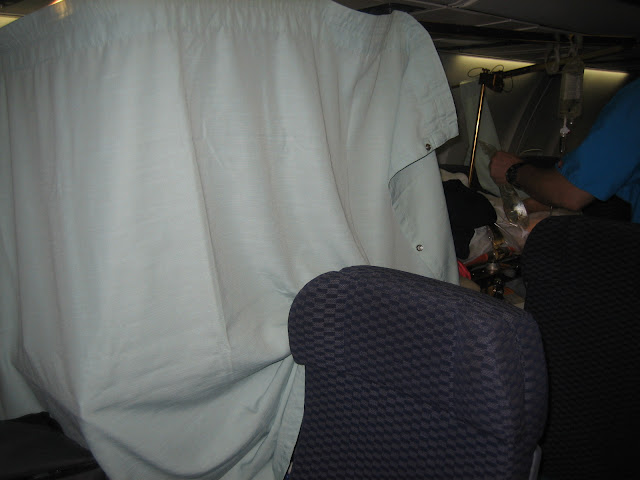 #4: Make shift ICU in the economy section of the plane. The outer 2 seats in 3 rows were folded forward and the stretcher was hoisted over them. We sat in the aisle seat of those 3 rows, working through a curtain. It was half to protect the girl for gawkers eyes and half to protect passengers from the disheartening image of a girl with a breathing tube.